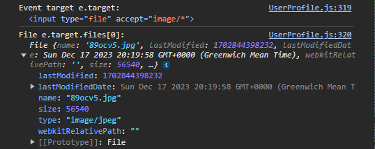 console.log("File e.target.files[0]: %o", e.target.files[0]);