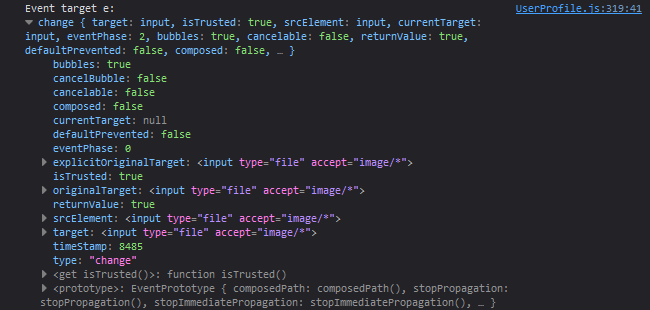 Suppose we now upload a file, triggering this input's event listener. The result of the first logging statement, logging the whole event object, looks like this: