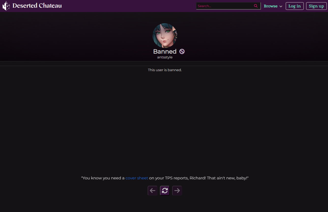 Previously, visiting the profile of a banned user resulted in a redirect to the 404 error page, but that's unintuitive and confusing. Instead, a banned user's profile now shows they are banned, and because I felt like it, the quotes from the error pages are also present there.