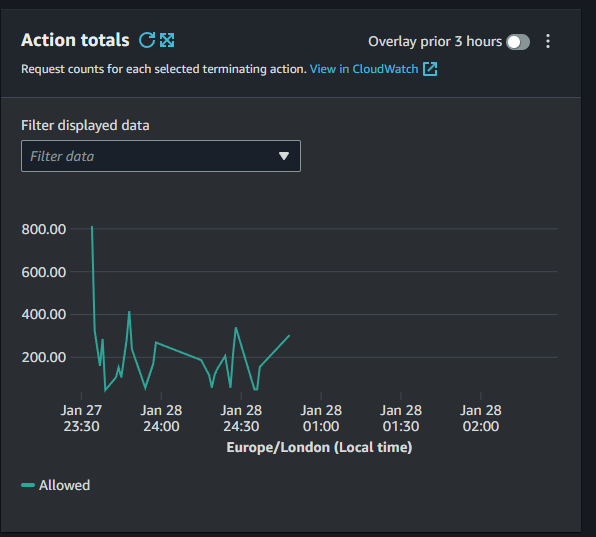 I'm thinking I might expand this a bit to allow users to customise how often their notification counts are updated, for those users who do not want notifications to update often (the standard is once per 15 minutes). On a side note, here's a graph from AWS WAF showing the total request counts to the test environments over a few hours today.