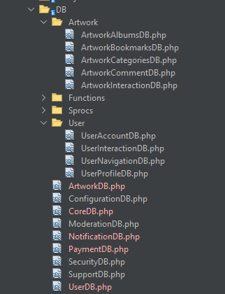 I've refactored them so that the main ArtworkDB and UserDB classes are still there, but that related functionality is in its own folder of classes. You can see what I mean here: