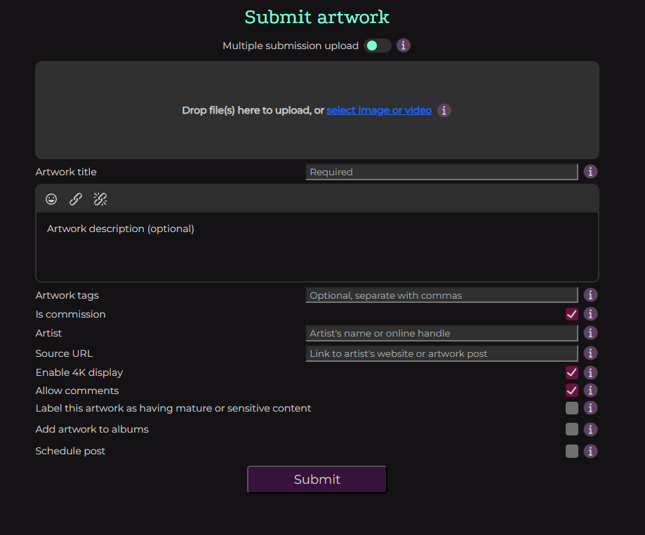 The "multiple submission upload" option allows users to submit multiple artworks at once if they are subscribed (a normal user can still put multiple images or videos in one artwork, but can only submit one artwork at a time). Toggling the option, and options like commission fields and schedule date/time, now have graceful animations and don't show redundant fields. For instance, someone who hasn't ticked the "Schedule post" checkbox doesn't need the schedule date/time chooser on the page, so hiding it when not in use makes the page easier to read.