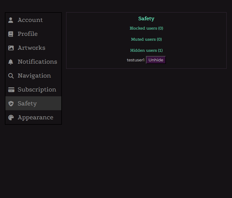 I've added a new settings page, Safety, which allows users to manage who they have blocked/muted/hidden. It's still in progress, but the functionality for it to work is mostly done. The remaining bits to do here are polishing up the styling, adding tooltip explanations, and maybe some other appearance-related stuff.