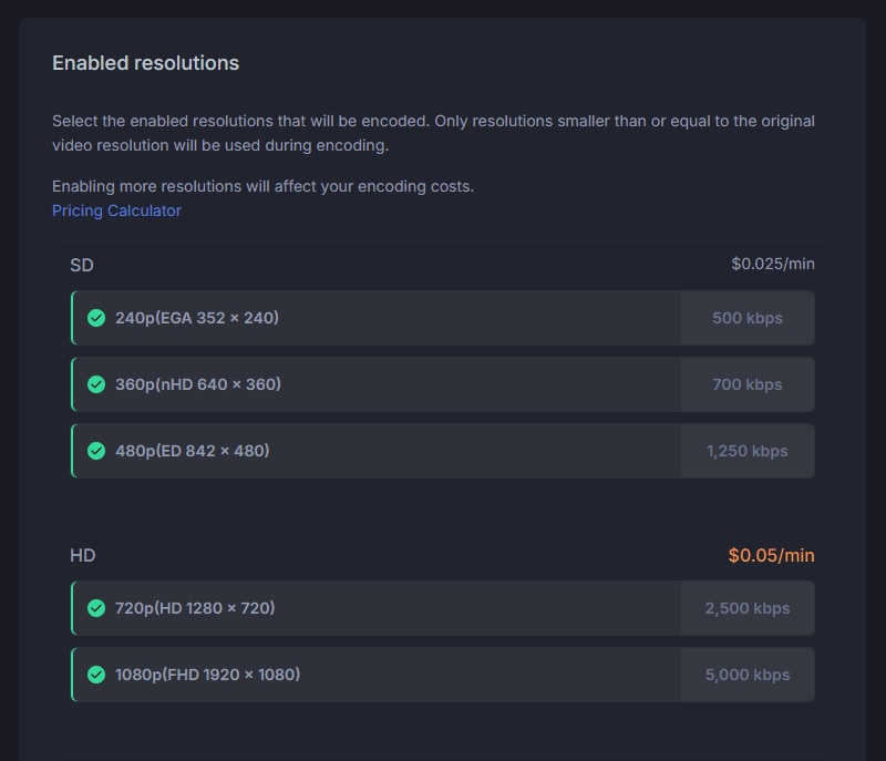 I've been going back and forth with Bunny about how they encode videos for their CDN behind the scenes, as the encoding settings only allow me to set a given bitrate for a given resolution, like this: