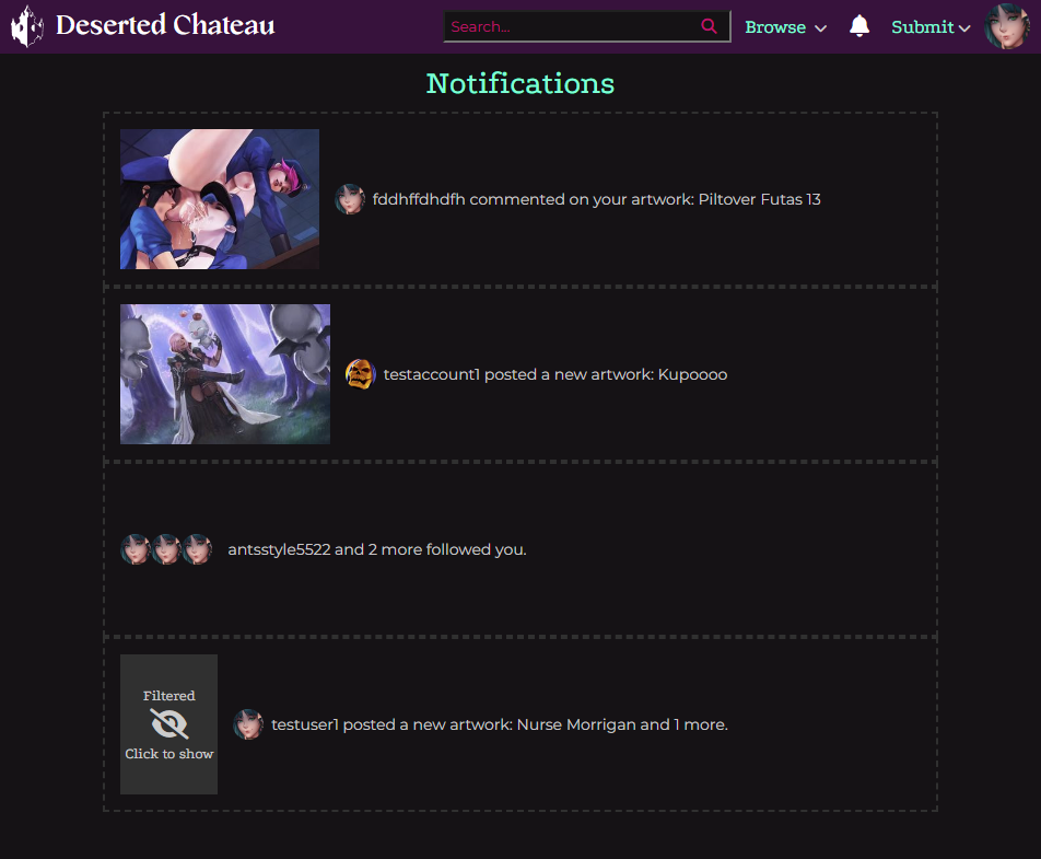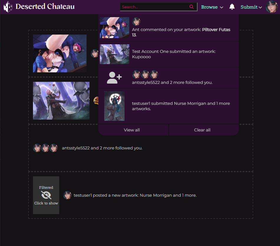 The styling still needs some work, particularly for the dropdown notifications; the borders are primarily there for development clarity at the moment, but they probably need to look nicer, alongside perhaps aligning the notification text to the same horizontal position for each notification so it's easier to read. The other things left to do are to add an option to the user_navigation_settings or user_notification_settings tables, to allow users to disable the filtering of artworks in their notifications, and to also enable filtering of artworks in the notifications dropdown.