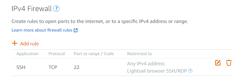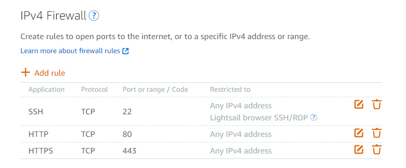 Since your Lightsail webservers are now only ever accessed from your CloudFront -> Load Balancer setup, you can remove the default firewall rules in the Lightsail console that allow incoming public HTTP and HTTPS connections. Normally the IPv4 Firewall in the console for a given server instance looks like this:
