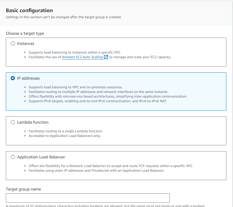 Select IP addresses as the target type, and make sure that the protocol is HTTPS. Continue on to the next page of configuration options. In "Choose a network", note that you can choose "Other Private IP Address", which is what we need to do.