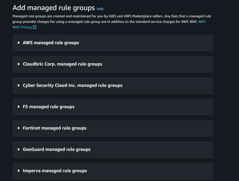 The non-AWS rule groups all require paid subscriptions; a few of the AWS ones incur extra charges beyond the normal $1/month per associated ACL, but many do not. Inside the AWS managed rule groups section, scroll down to the Free rule groups.