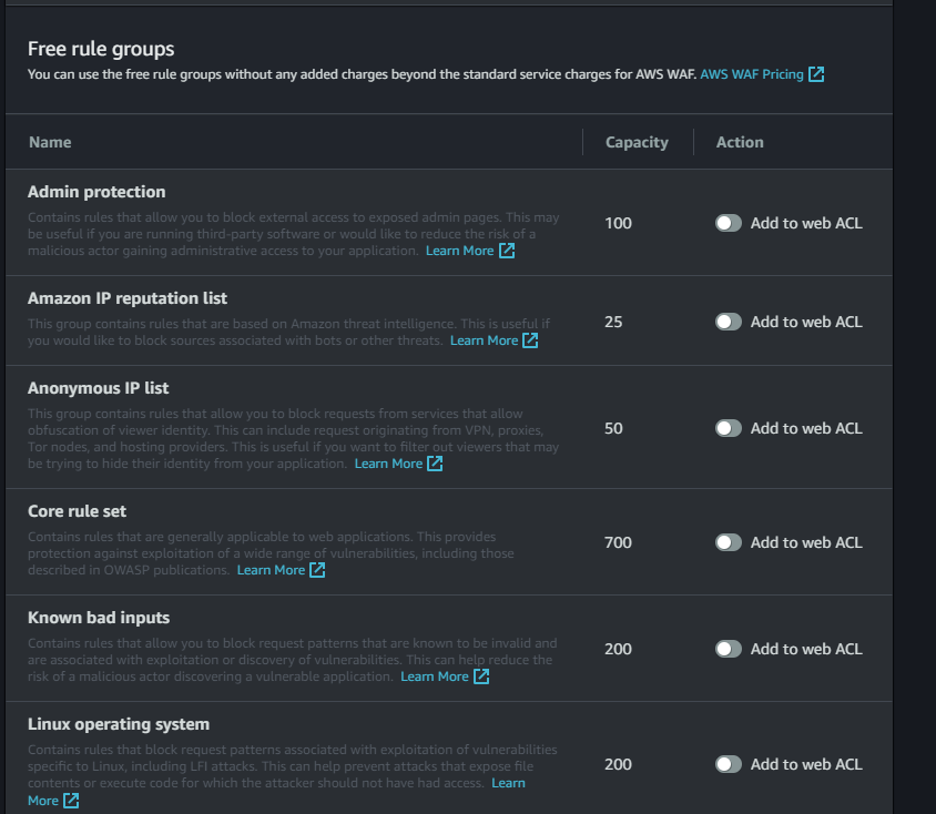 There's more than shown on this screenshot, but this group is where most of the rule groups you want reside (thankfully, since they're not subject to extra charges). You should be able to add the rule groups you need without exceeding the 1500 WCU limit - here are some of the important ones: