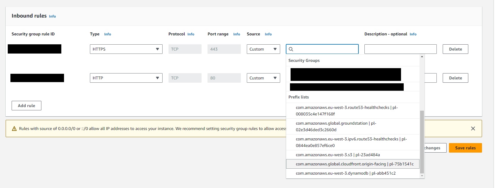 Once you have your increased quota, go to the VPC Console and select Security Groups from the left menu. Create a security group that has only one inbound rule, for HTTPS. When specifying the Source, scroll down to the bottom of the list of suggestions to the Prefix List and select the one for CloudFront.