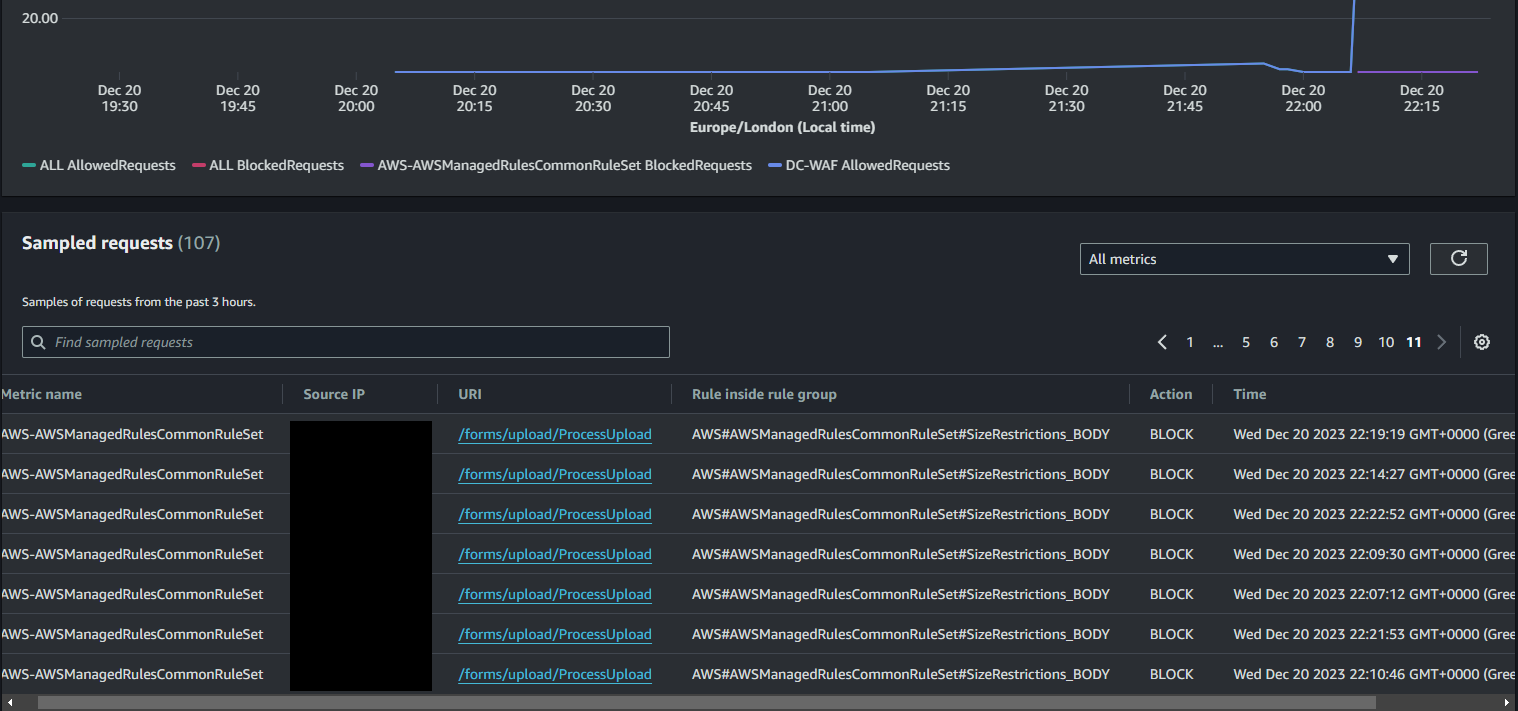 To fix this, go into the details area of your WAF ACL, go to the Rules tab, and edit the AWSManagedRulesCommonRuleSet. Modify the override behaviour for the SizeRestrictions_BODY rule to Allow: