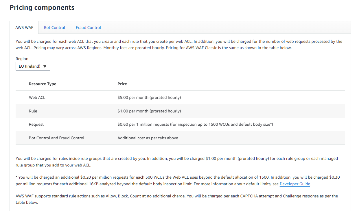 Be aware that, although the AWS managed rule groups that are listed as "free" don't incur any specific extra charges, they do still incur the standard $1/month fee for each rule attached to your WAF ACL.