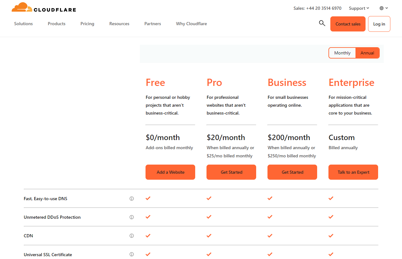 CloudFlare is rather unique among CDN providers for having a 'free plan' which doesn't cost anything. However, this can be something of a misnomer: although it is genuinely free, it is not free without limit. It's intended for small websites, not business websites, and CloudFlare reserves the right to restrict or remove a website from their CDN that e.g. uses the free plan for business use.