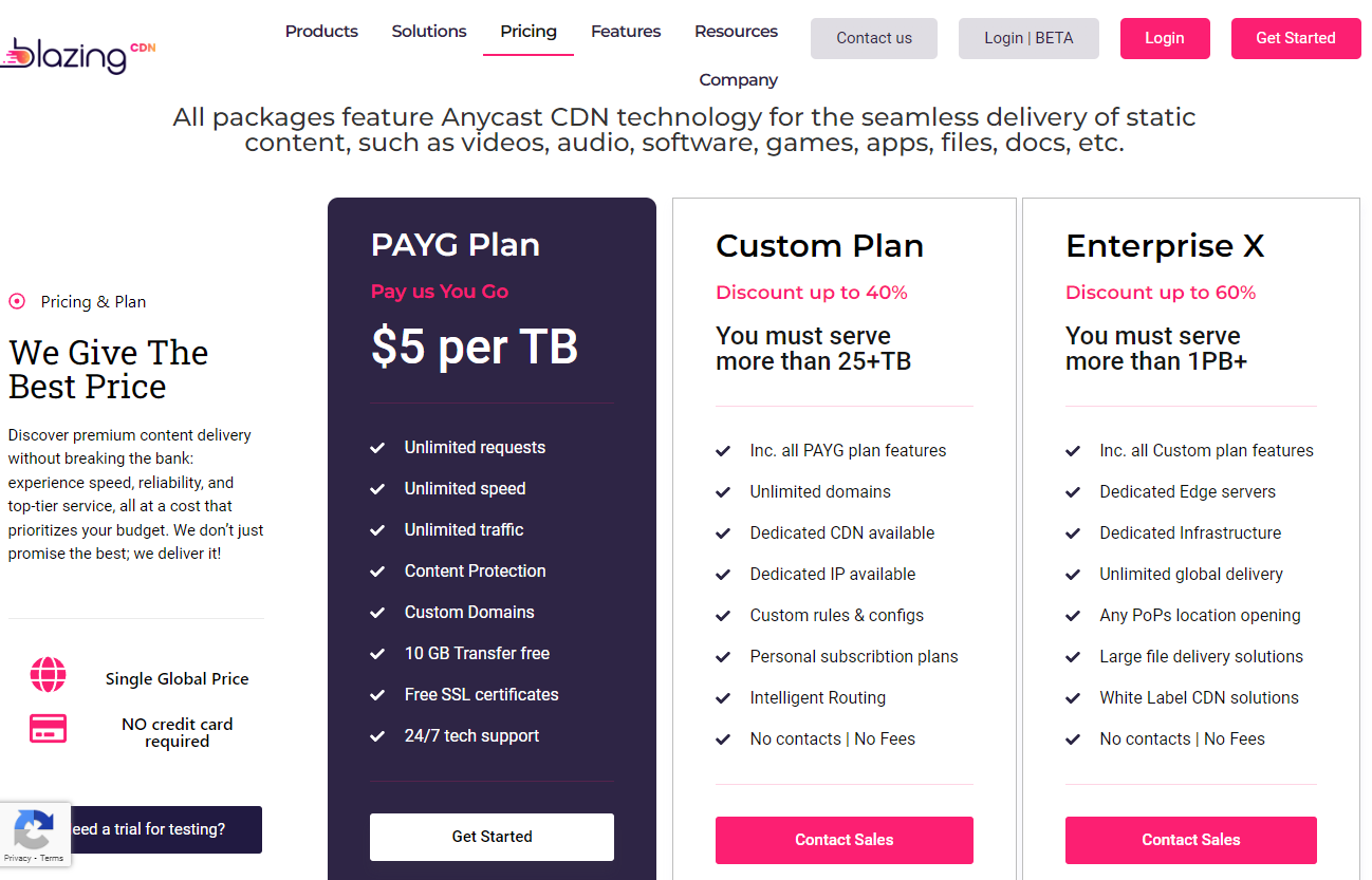 BlazingCDN has the same price as BunnyCDN's volume option ($5/TB or $0.005/GB), and slightly more PoPs (25+, at the time of writing). The larger plans have significant savings, providing you are serving a lot of content; that said, 25TB is only $125 a month worth of bandwidth on the normal plan, so being able to get a decent discount at that point is nice.