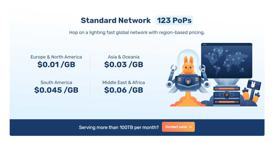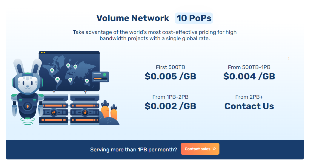 Bunny is one of the CDN providers that have a "volume" option. This is basically a tradeoff: the volume option has fewer "Points of Presence" (i.e. less servers in the CDN to deliver content), but in return, has a significantly lower price.